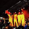 "myoclonies phrénoglottiques" ouvre la soirée de manière inattendue...Ah pardon, excusez-moi pour les non-initiés, c'est leur nom scientifique.D'entrée ils annoncent la couleur, ce sera fun, décoincé, drôle, ingénieux, décalé...Et cela fonctionne à merveille avec un chanteur habité par un enthousiasme à toute épreuve, "Hoquets" fait l'unanimité. Des instruments bricolés à l'arrache avec des bouts de bois,des planches, des cordes, des casseroles MAIS tous avec Le son qui va bien. Surprenant d'efficacité, un feeling qui leur appartient et un groove à faire pâlir tous les Dj's de la planète (j'exagère mais pas trop). Le patrimoine belge est mis en avant sur quasiment tous les textes (La couque de Dinant, Benny B., le maitrank et j'en passe certainement) et de bonnes vannes sont lâchées tous les deux mètres. Le top vient avec "Chaud Boulet" un titre tout droit sorti d'une animation de club de vacances où nous sommes soumis à contribution avec un mouvement de va et vient du bassin et des bras et tout ça sous l'oeil du chanteur qui donne l'exemple et s'excuse pour le petit dérangement occasionné pour le bon déroulement de la chanson...Super, bravo, on en redemande, foncez les voir si vous en avez l'occasion...